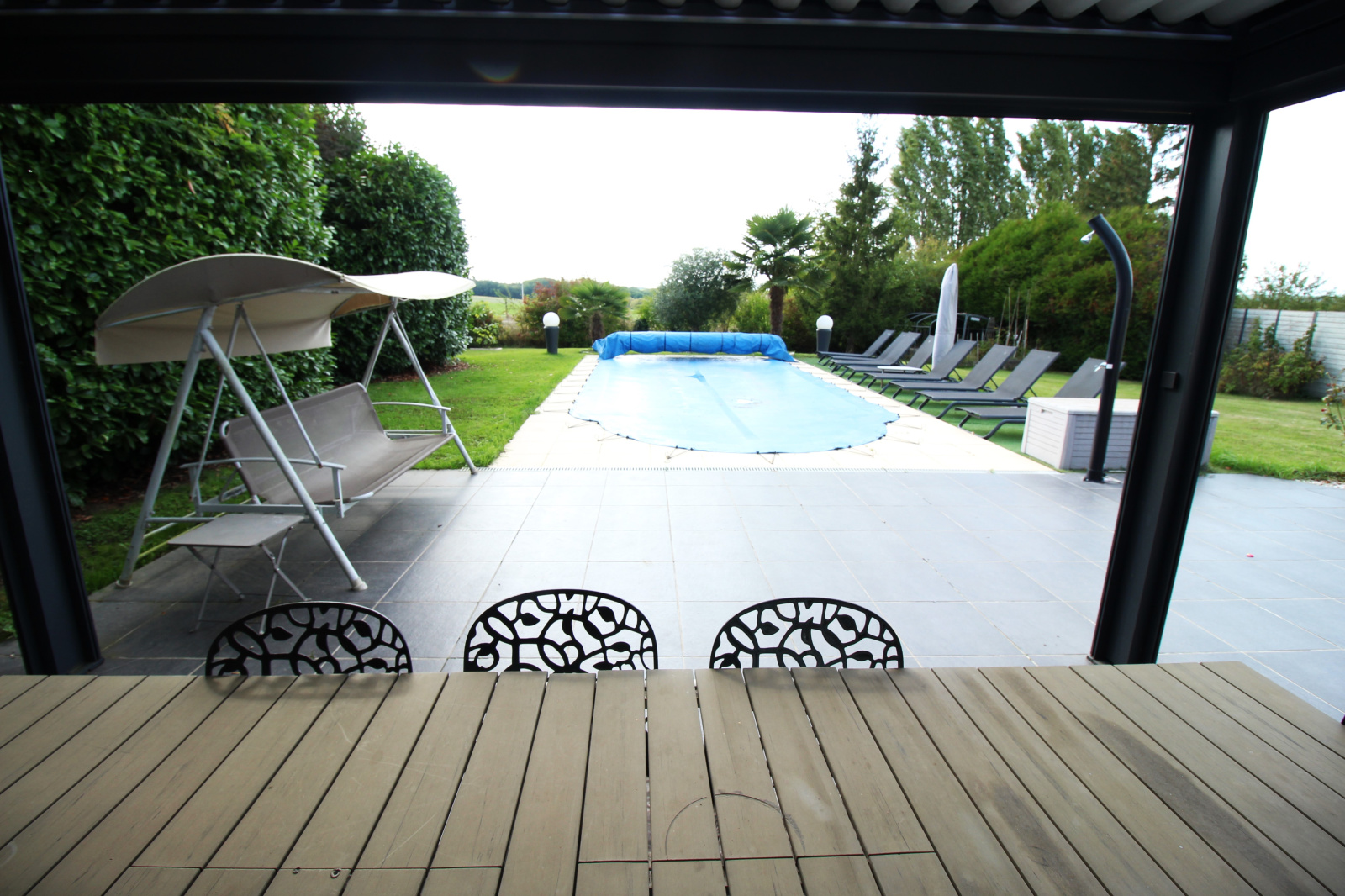 Côté terrasse, en partie protégée par une pergola bioclimatique avec trois rideaux électriques, vous profiterez d'une vue dégagée sur le jardin, avec piscine chauffée et équipée d'une douche extérieure.