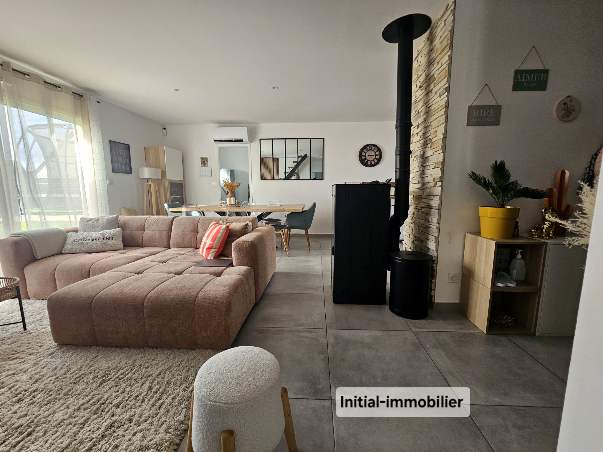 Spacieuse pièce de vie lumineuse avec poêle à granulés et climatisation réversible