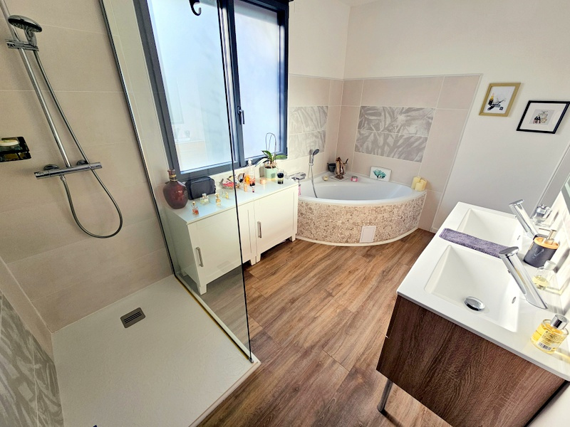 Le bien se compose d'une pièce principale d’environ 45m2 avec salon/salle-à-manger (baie-vitrée donnant sur la terrasse) et cuisine US aménagée/équipée, un cellier, une chambre de 15,9m² avec dressing, une salle de bains de 7,9m² avec baignoire d'angle et douche italienne (+ coin machines), WC ; à l'étage un palier/coin bureau, deux chambres (16m² et 17,7m² au sol), salle d'eau, WC. Terrain clos de 1507m2...