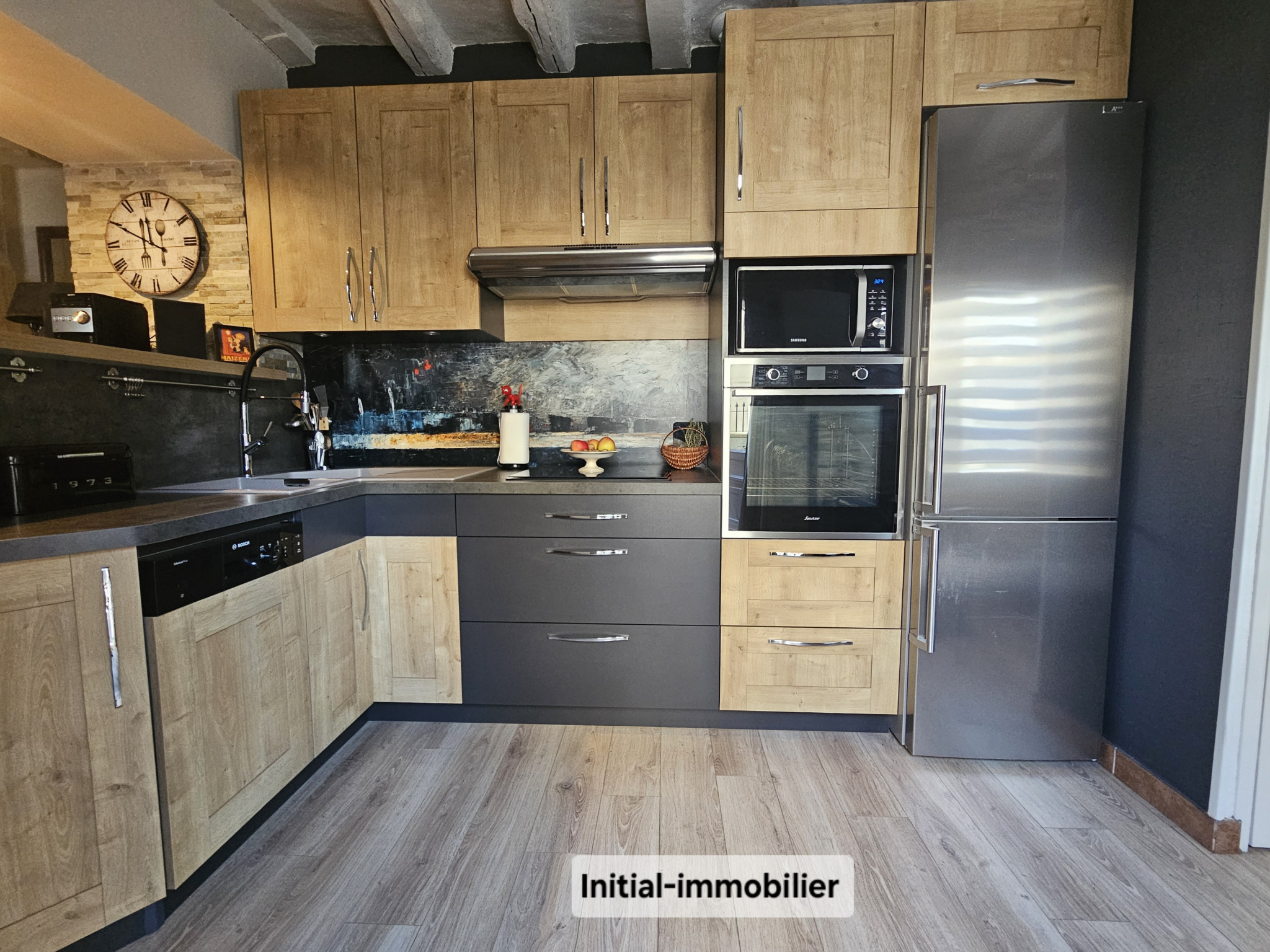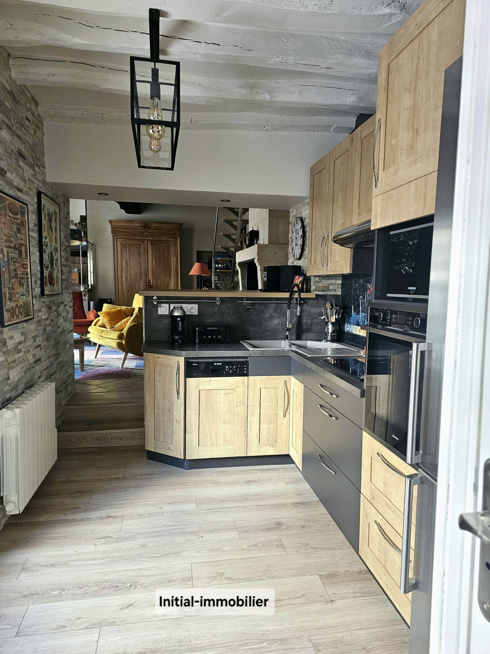 - Description : Belle pièce de vie avec cuisine ouverte, poutres apparentes et murs en pierre .